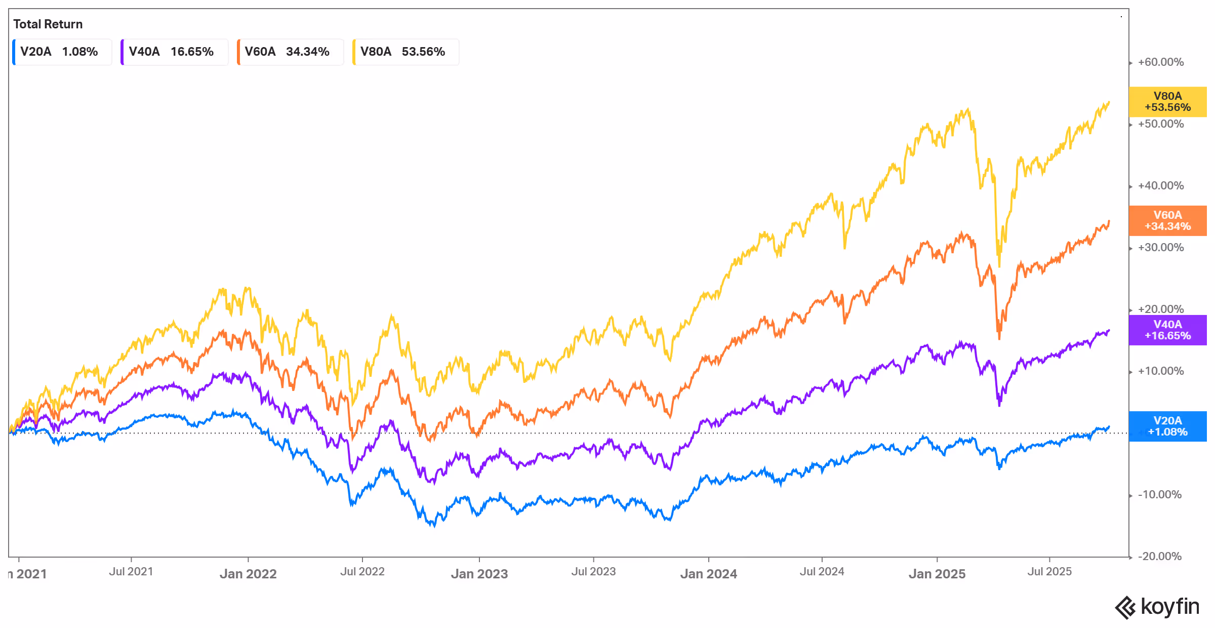 Existem vários fundos LifeStrategy, cada um com uma alocação distinta entre ações e obrigações.