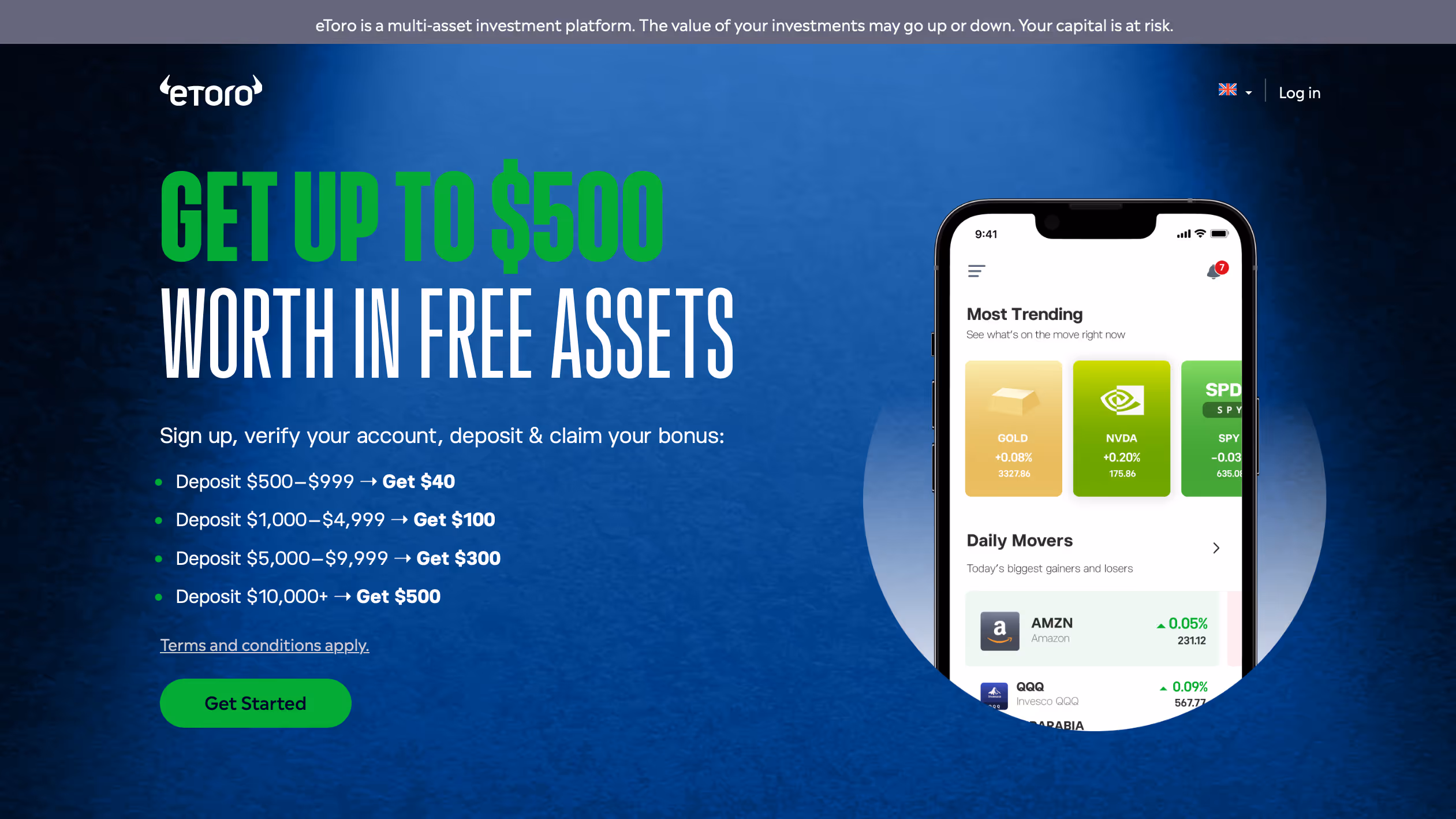 Esta campanha atribui um bónus em ações ou criptomoedas a novos utilizadores da eToro que cumpram determinados requisitos. Quanto maior o depósito, maior o bónus.