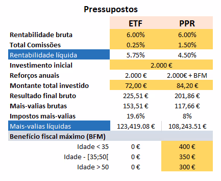 Imagina o caso hipotético do índice MSCI World replicado por um PPR e por um ETF. As rentabilidades brutas vão ser muito similares, mas o ETF tende a ter menores comissões de gestão, enquanto que o PPR tem benefícios fiscais (para este efeito, considerámos o benefício fiscal máximo por gama de idades).