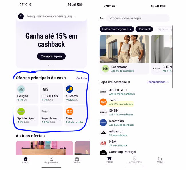 *No site, fala em cashback até 10%, mas na app vemos lojas a oferecer cashback até 15%, como revelam os screenshots da minha conta pessoal mais embaixo.