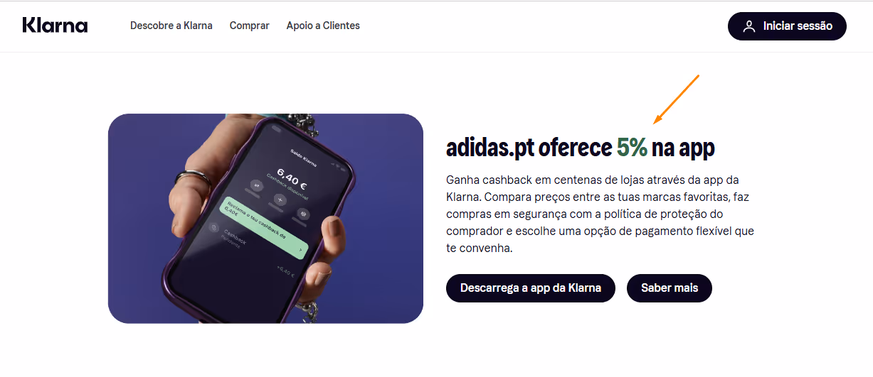 Além da flexibilidade de pagamento, a Klarna procura incentivar o consumo através de cashback. Em Portugal, os utilizadores podem receber até 15% de cashback em marcas parceiras, quando a compra é feita pela app.