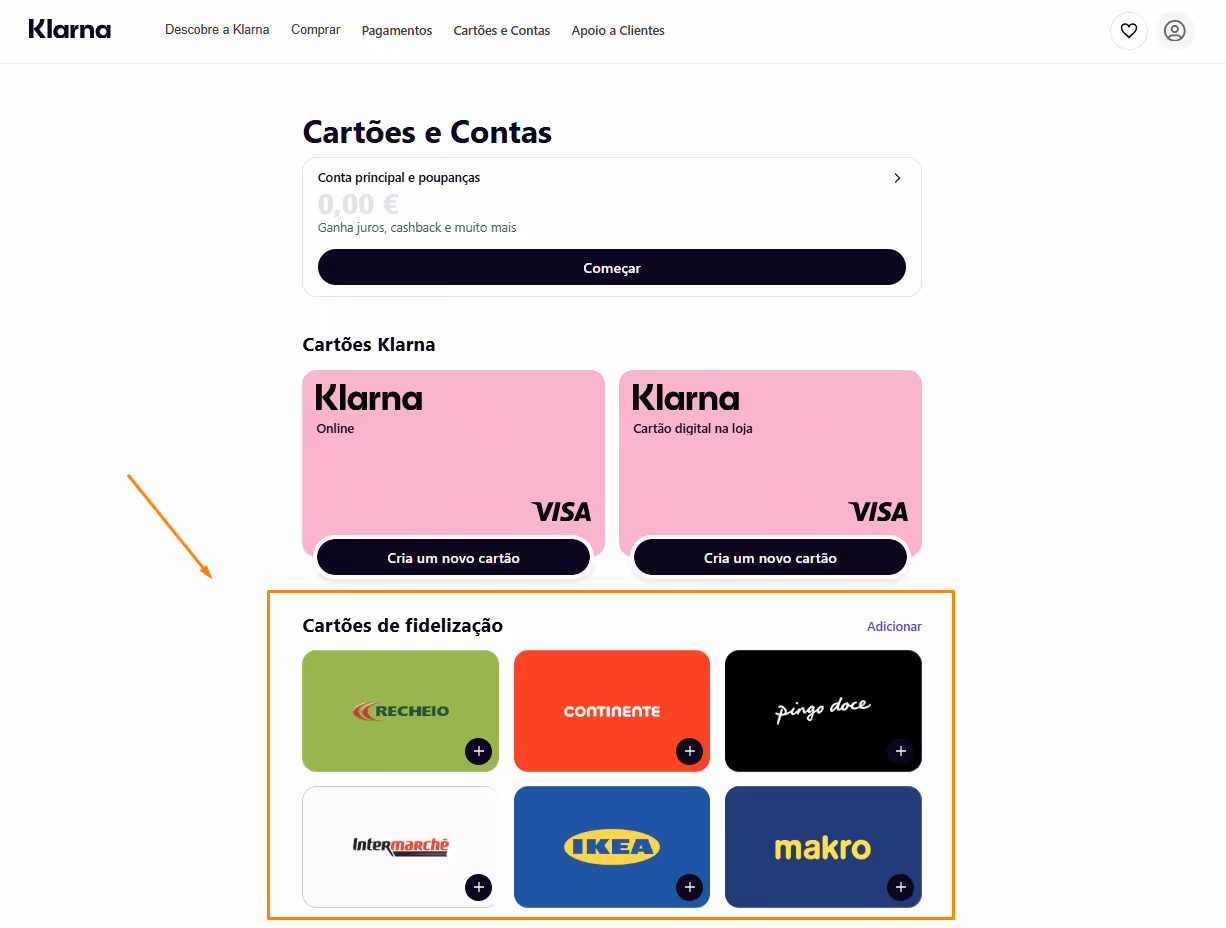 Em “cartões e compras”, ainda podes adicionar cartões de fidelização: