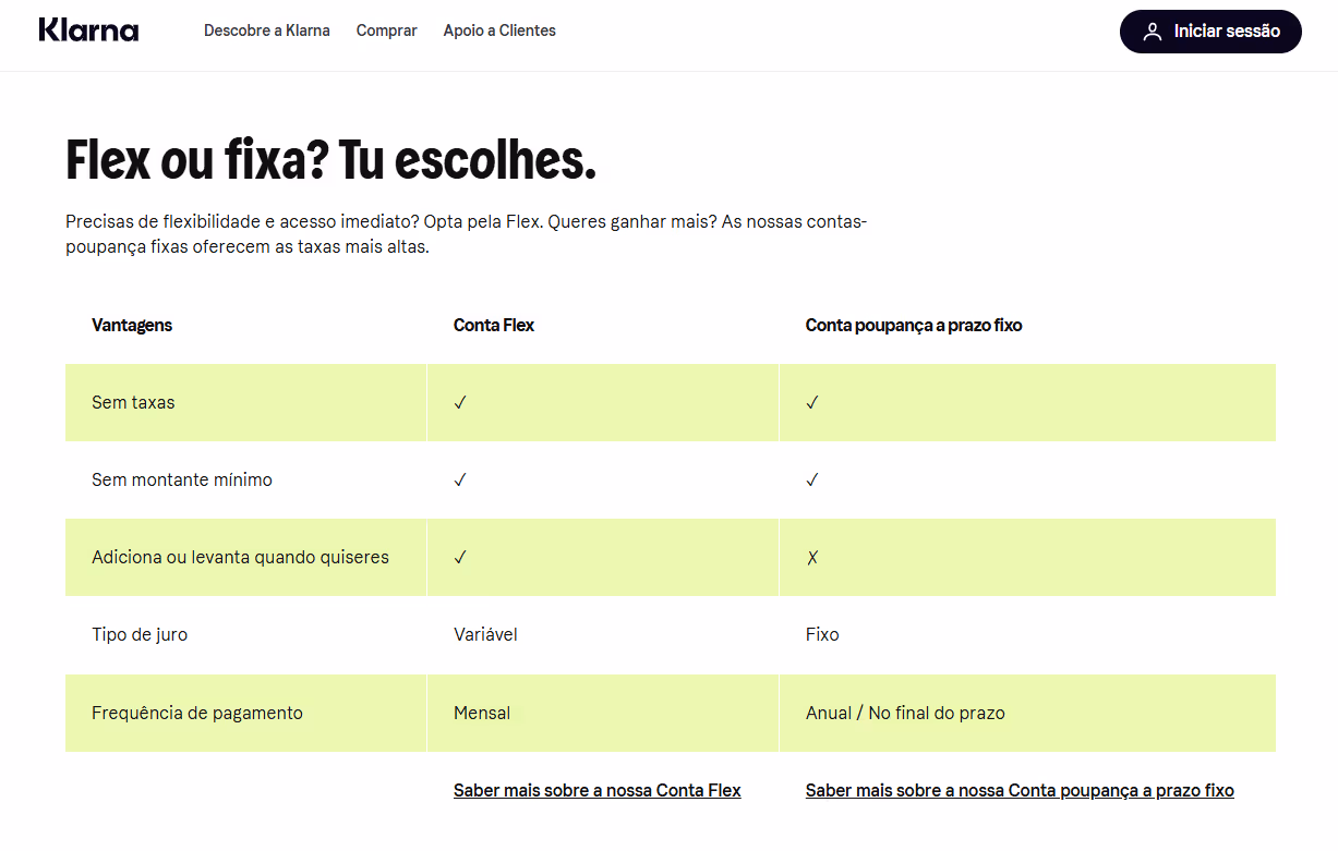 Nesta análise, focaremos a nossa atenção não só na perspetiva de um consumidor, mas também na visão de um aforrador, já que a Klarna oferece contas poupança (Flex e a prazo fixo).