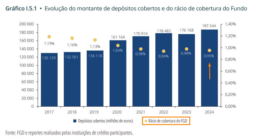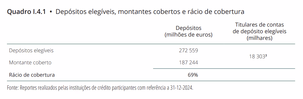 Segundo o relatório e contas de 2024, “o rácio de cobertura dos depósitos elegíveis para efeitos da garantia do Fundo (i.e. rácio entre o valor dos depósitos até ao limite da garantia e o valor total desses mesmos depósitos) era de 69% (...)”.