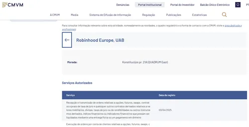 Nota: a Robinhood Europe, UAB está registada na CMVM desde março de 2025, como se vê no portal da autoridade portuguesa.