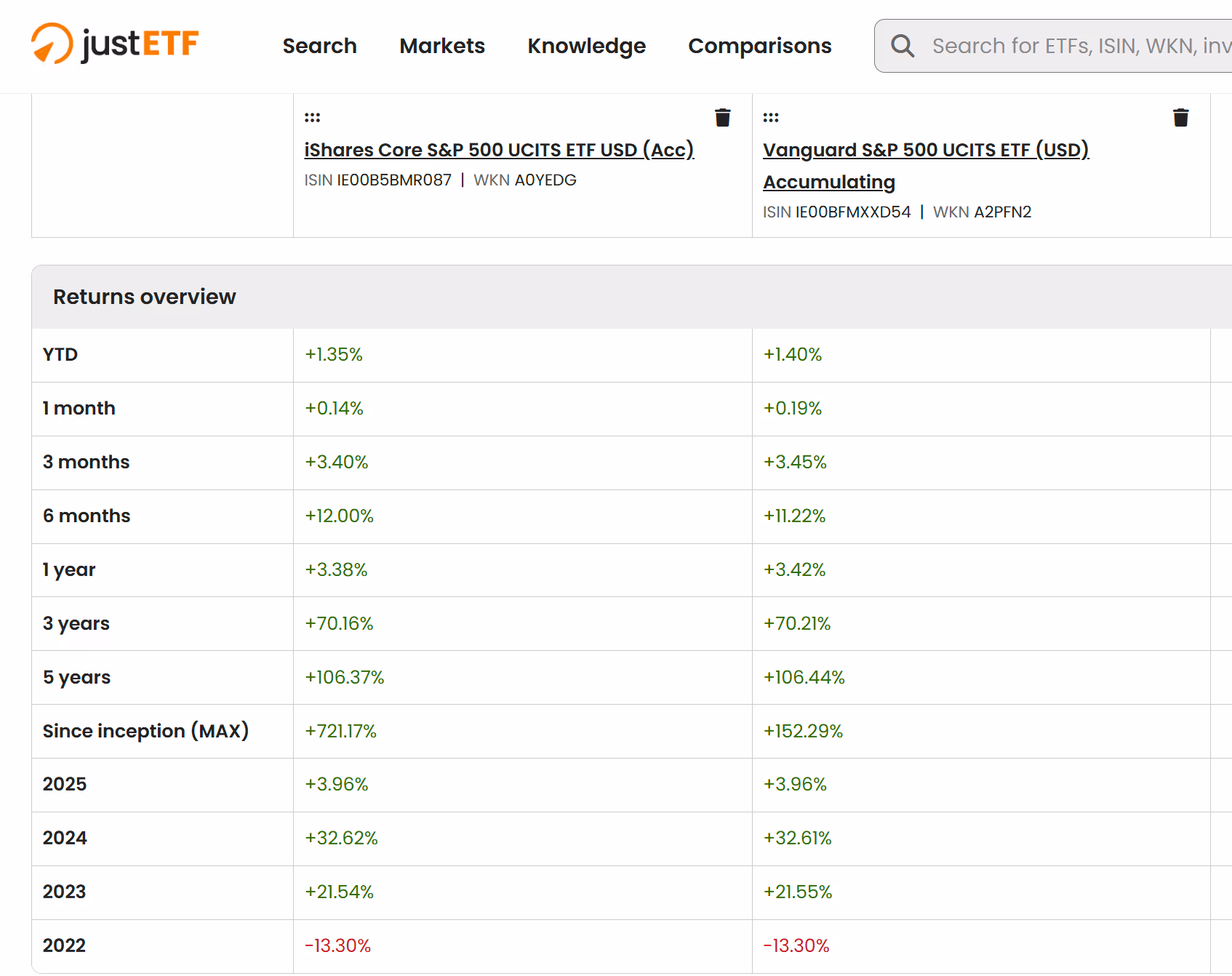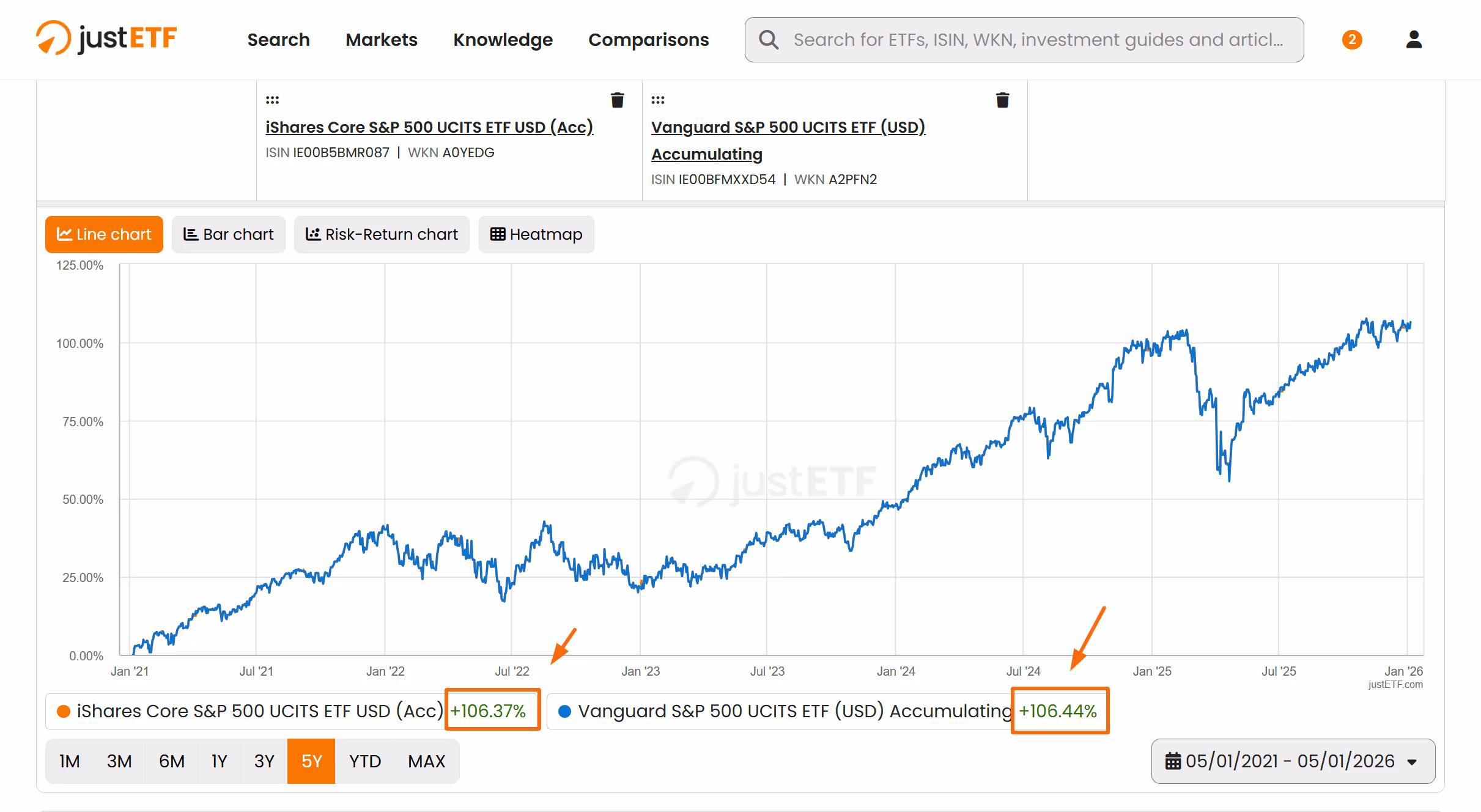 Como ambos os ETFs replicam o mesmo índice, apresentam os mesmos custos e o mesmo tipo de replicação, a rentabilidade de cada um será semelhante, como podes ver na imagem (as duas linhas estão sobrepostas, mas parece só uma linha):