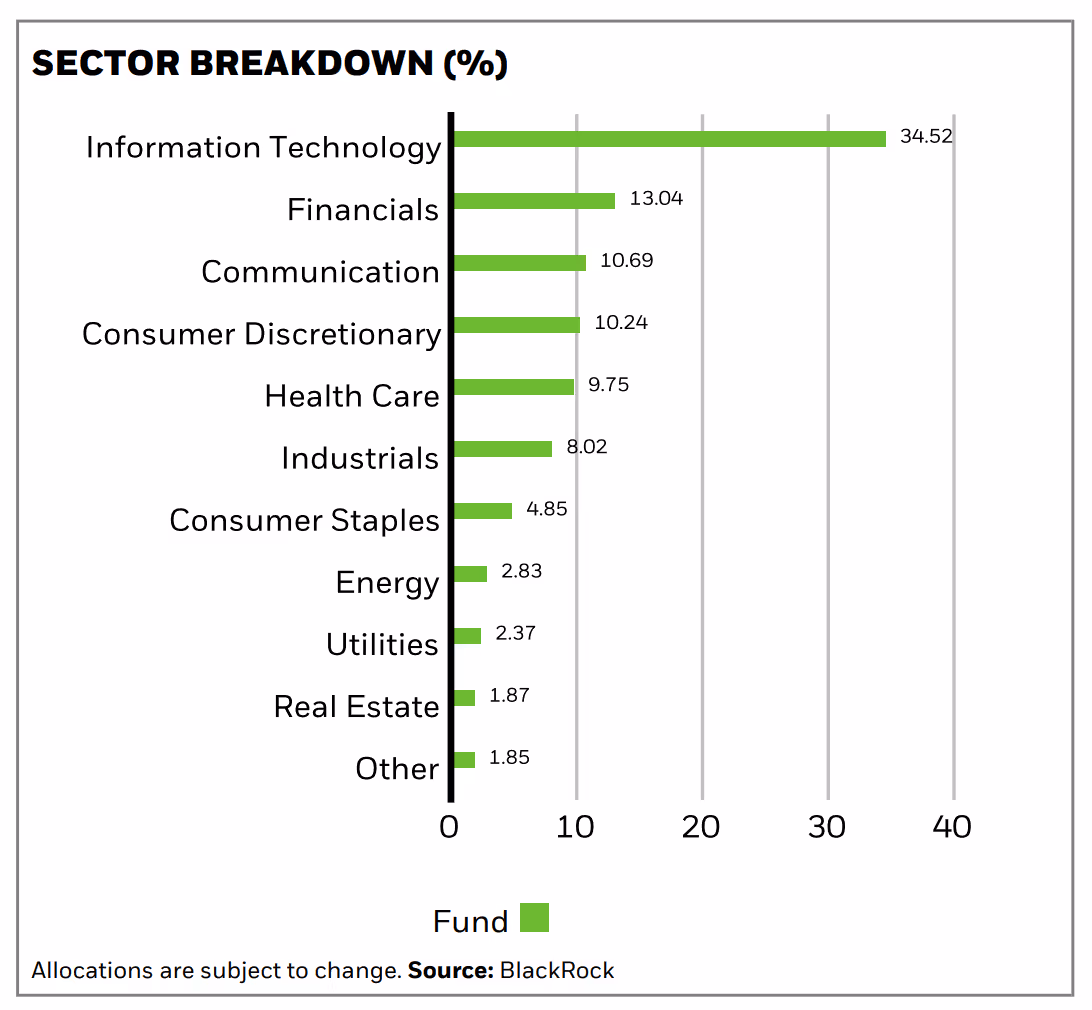 A distribuição setorial de ambos os ETFs é aquela verificada no índice S&P 500. Como vês na imagem abaixo, os setores com maior peso são os das Tecnologias de Informação, Financeiro e Consumo Discricionário: