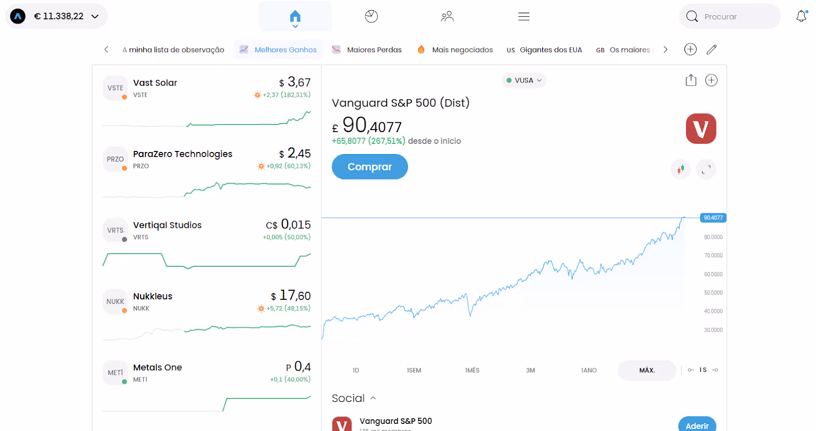 A Trading 212 é reconhecida pela simplicidade e intuitividade da sua plataforma, ideal para investidores iniciantes. Também oferece investimento em ações e ETFs sem comissões (sem limite) e permite receber juros sobre o dinheiro não investido e empréstimos de ações.