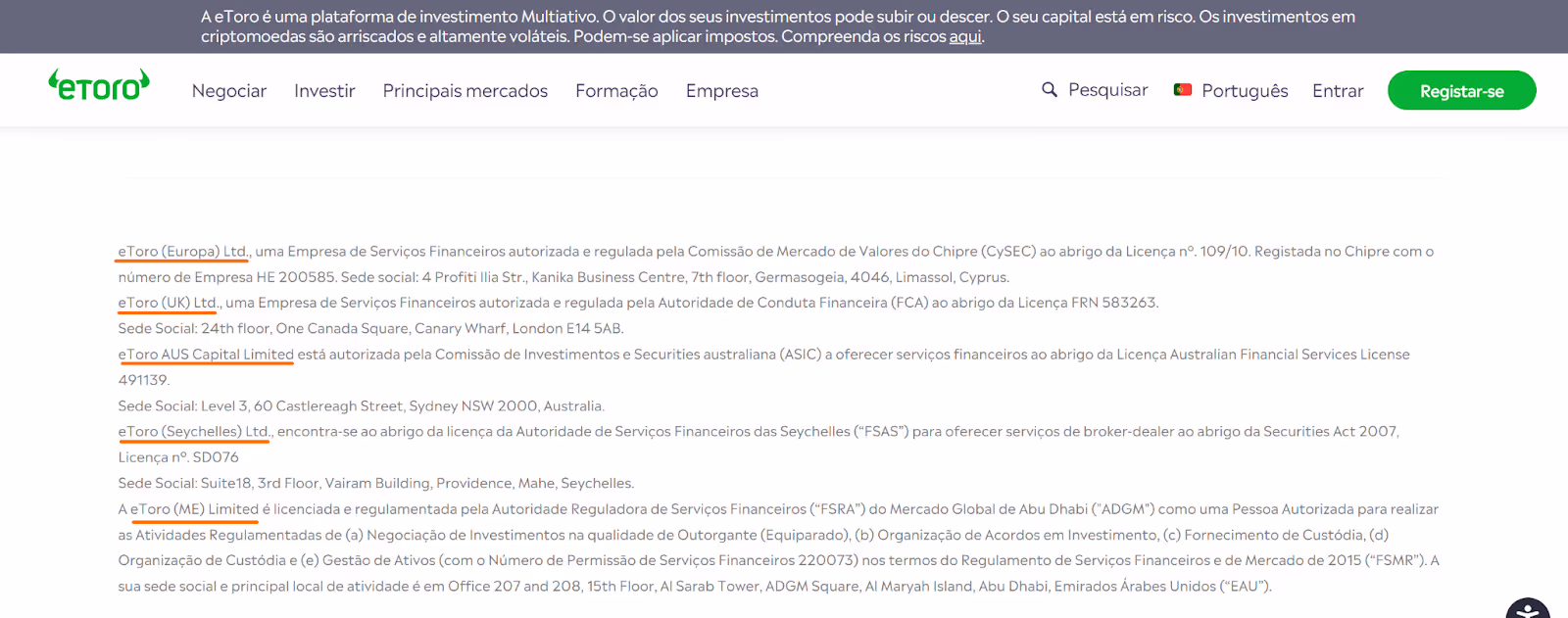 Outras entidades do grupo eToro incluem a eToro (UK) Ltd regulada pela FCA, a eToro AUS Capital Limited regulada pela ASIC e a eToro USA Securities Inc. registada junto da SEC e FINRA nos Estados Unidos, como podes na parte debaixo do próprio site da eToro: