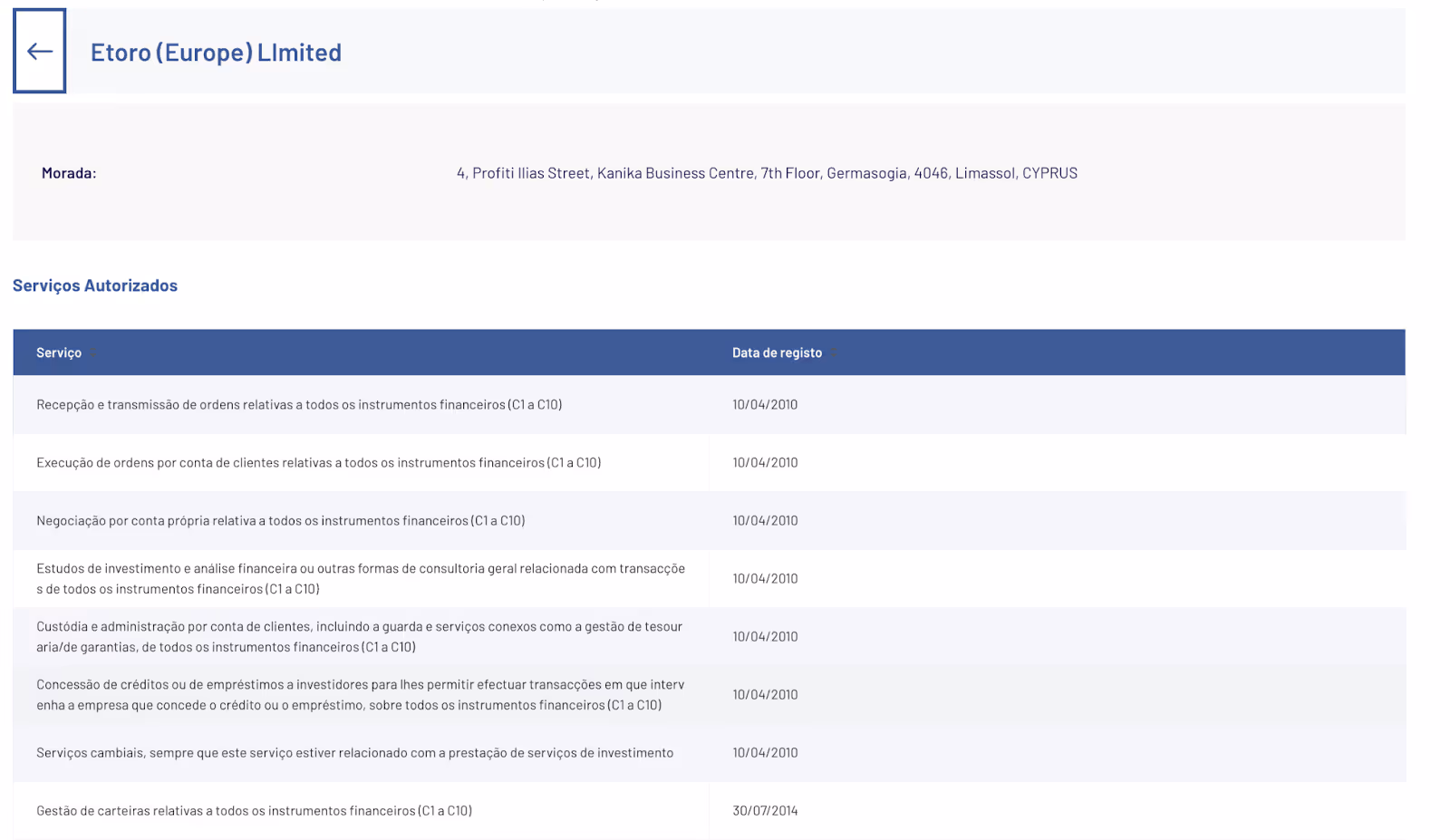 Ao abrires conta a partir de Portugal, a entidade pela qual o farás será provavelmente pela “eToro Europe Ltd”, regulada no Chipre, sendo que podes verificar esta informação no momento em que te regista na plataforma: