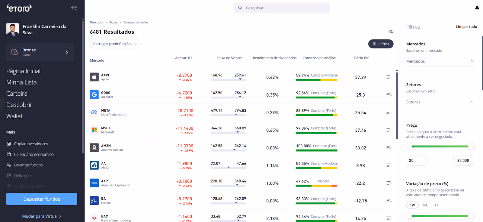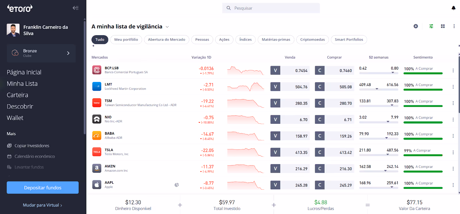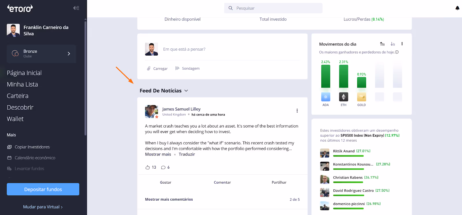 Após fazer login, encontras um dashboard que inclui o portfólio, watchlist, feed de notícias, mercados e o acesso aos Popular Investors.