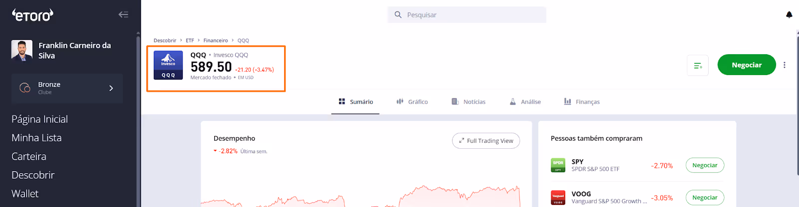 Como podes ver na imagem abaixo, parece que estou a comprar o QQQ, um ETF muito conhecido nos EUA, mas na verdade estou a comprar um CFD, um produto totalmente diferente de um ETF.