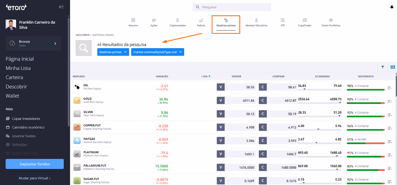 A plataforma também oferece mais de 45 CFDs com exposição a matérias-primas. Reforço que não estás a comprar a commodity em questão, apenas um instrumento que te dá exposição a essa matéria-prima.