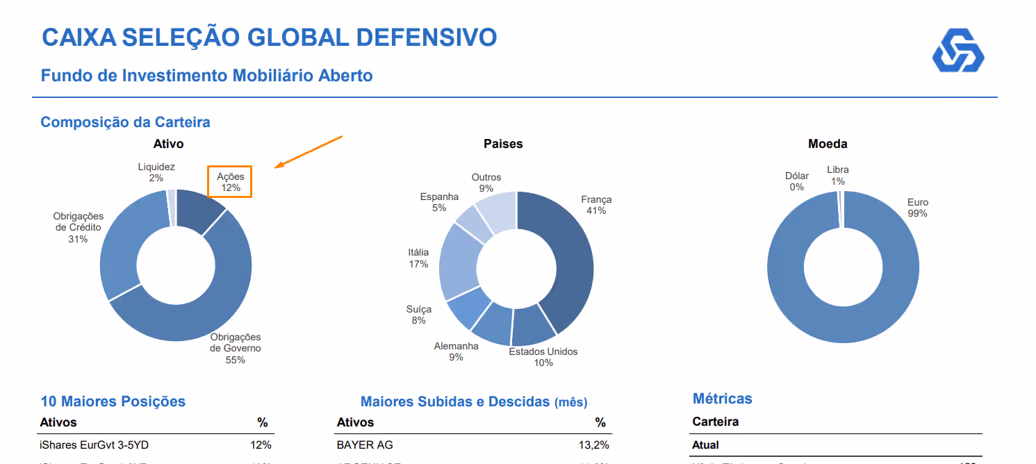 Por exemplo, o fundo Caixa Seleção Global Defensivo é composto por apenas 12% em ações, sendo o restante dominado por obrigações, o que faz com que seja “Defensivo” como indica o seu próprio nome: