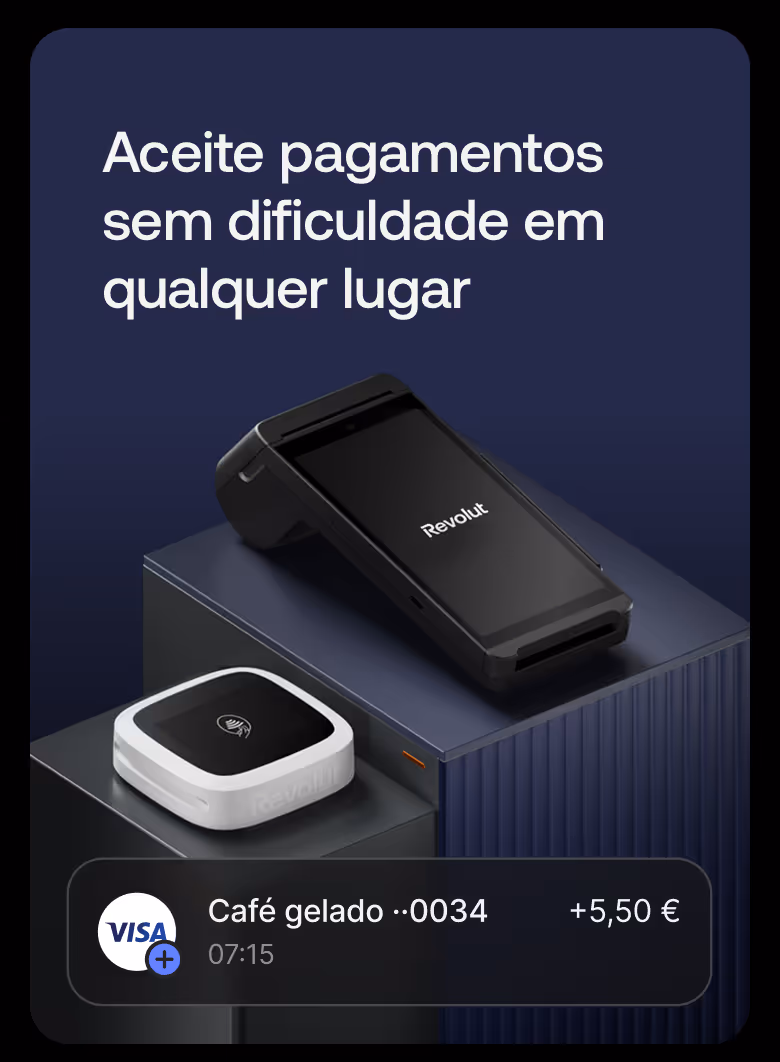 A Revolut Business permite às empresas aceitar pagamentos presenciais através do seu terminal de pagamento (TPA), uma solução simples e moderna para lojas, cafés, serviços, consultores e qualquer negócio que precise de receber pagamentos fisicamente (aplicam-se comissões e T&Cs).
