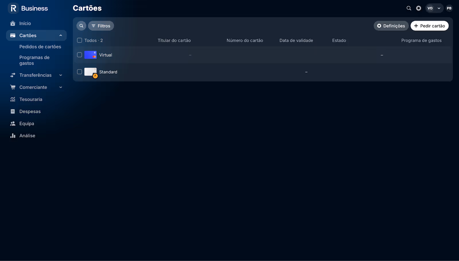 - Cartões: Gestão de cartões físicos e virtuais, definição de limites, controlo de permissões e criação de cartões adicionais para a equipa.